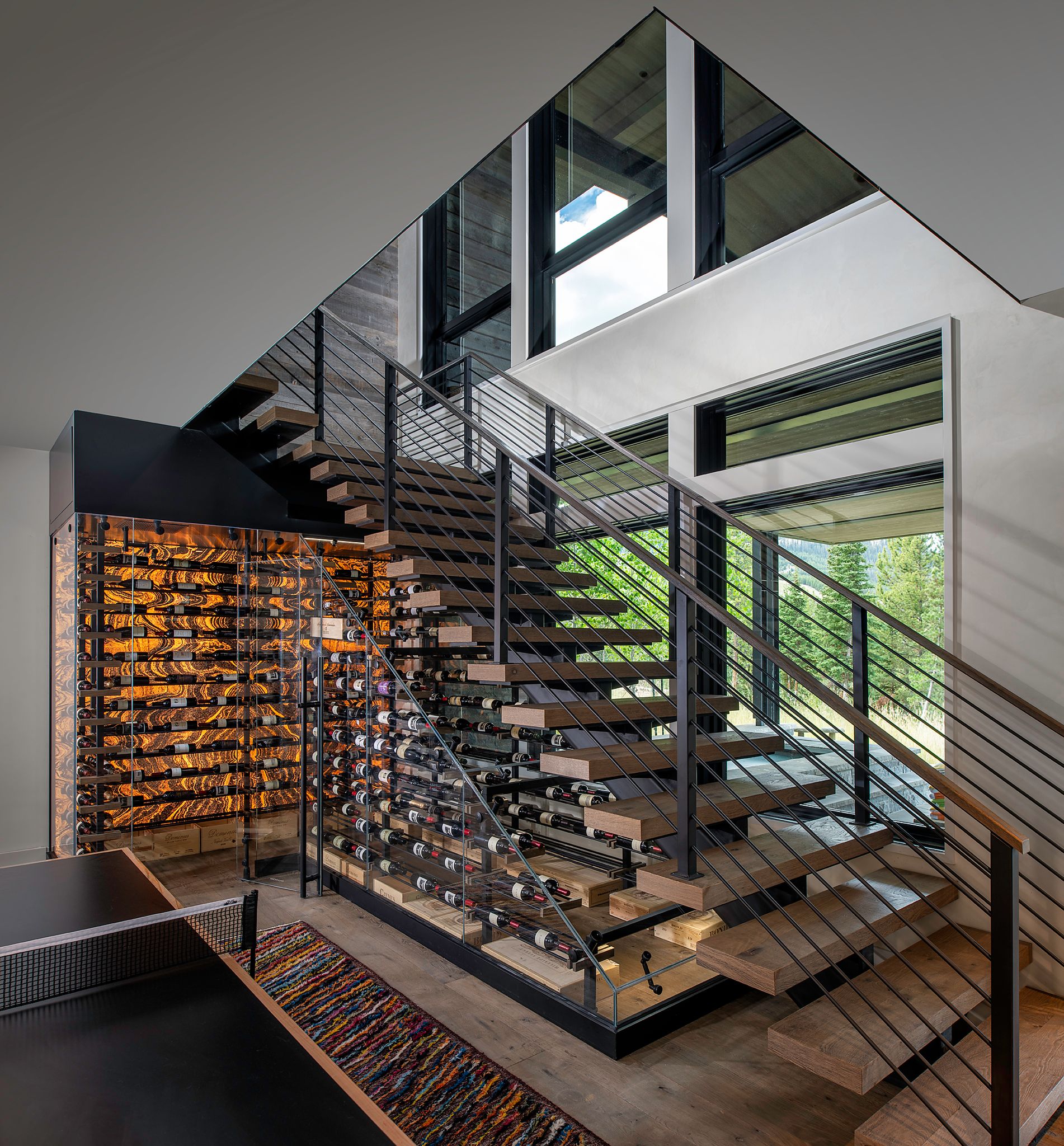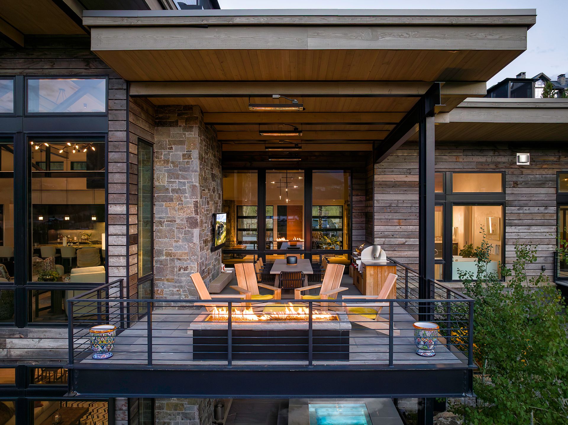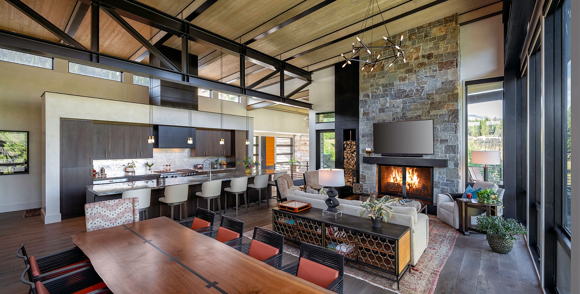 A mixture of horizontal wood siding and natural stone makes up the composition of exterior materials, blending with the rugged natural landscape of the Rocky Mountains. The interior will incorporate steel beams, adding to the modern aesthetic.